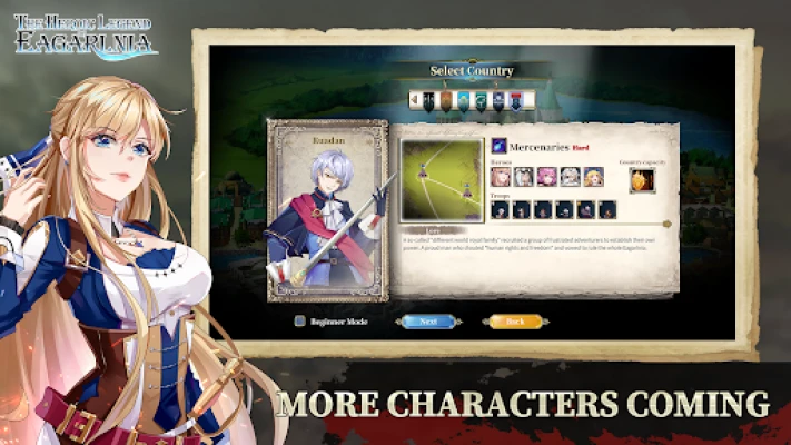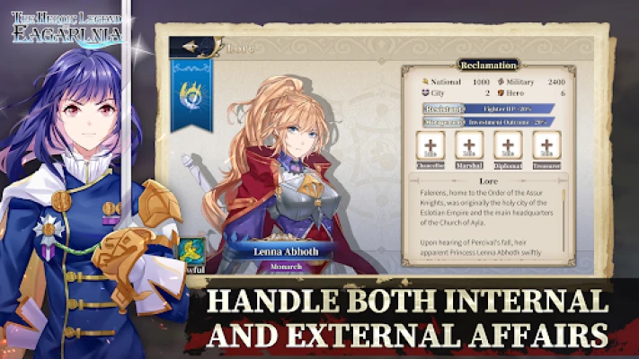 Zaronite duboko u svet u kojem svako biće ima svoju priču, a nekadašnji rivali mogu postati saveznici. Postepeno ćete otkrivati skrivene veze među više od 350 heroja, od kojih su neki mudri, drugi hrabri, a neki lukavi i prepredeni. Od samog početka igre, Eagarlnia vam omogućava potpunu personalizaciju: podesite početne uslove svoje nacije, upravljanje resursima i ponašanje veštačke inteligencije. Vrbujte ove raznolike heroje putem poseta, lobiranja ili čak zarobljavanja, strateški ih koristeći za jačanje svoje vladavine. Neki od njih kriju i posebne artefakte, čekajući da budu otkriveni kroz specifične misije.