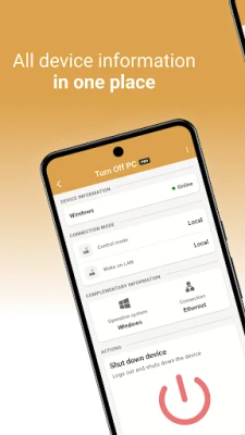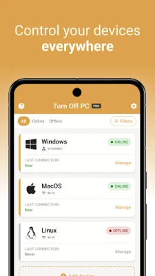 Sa Turn Off PC pro, vaši desktop i laptop računari su vam na dohvat ruke. Bez napora ih pokrenite, elegantno ih ugasite, postavite u stanje mirovanja radi uštede energije ili ih jednostavno restartujte – sve to sa udaljenosti. Bilo da koristite Windows, Mac ili Linux operativne sisteme, Turn Off PC pro pruža široku kompatibilnost, obezbeđujući besprekorno iskustvo za sve vaše platforme i omogućavajući vam da efikasno manipulišete stanjem svakog pojedinačnog uređaja ili grupe uređaja.